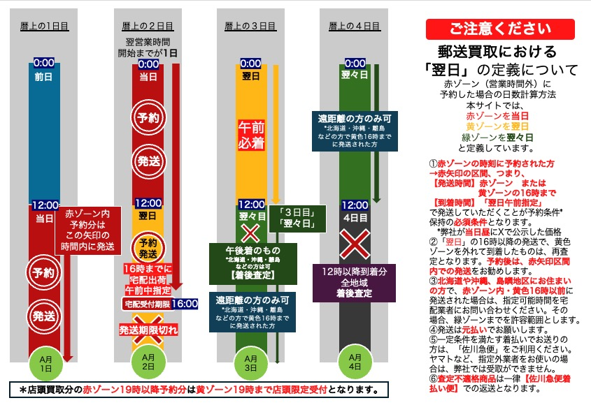 ・弊社が指定する着店時間(「翌日午前中」)を通ぎた場合、再査定となります。